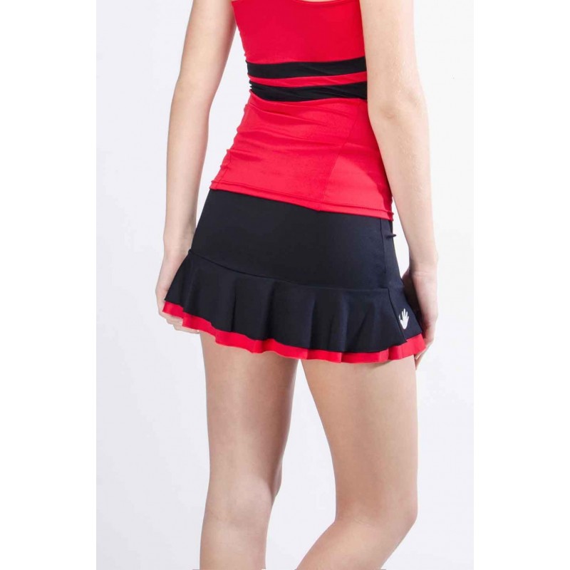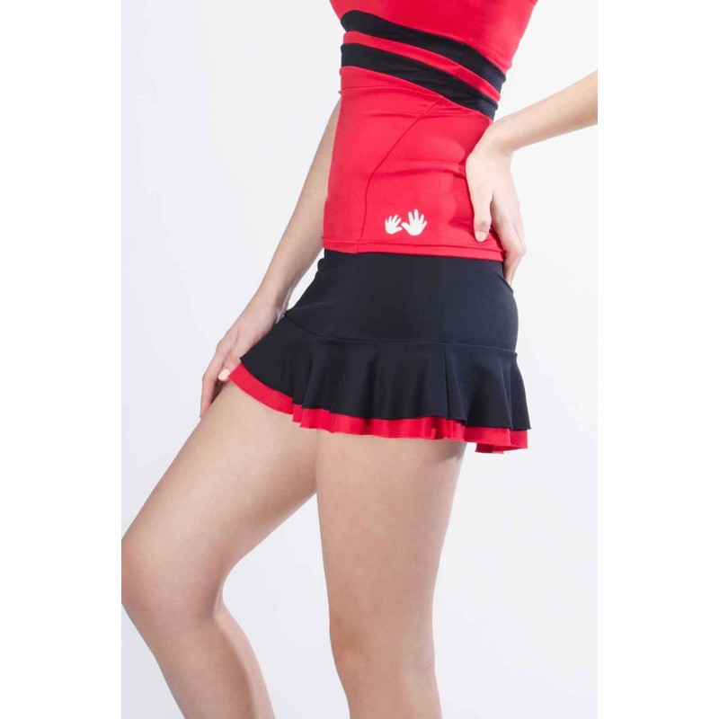 Falda de doble volante de diferente color, que con el movimiento crea aún más contraste. Coqueta, con un punto sexy El culote va a juego con el último volante La falda es siempre un dedo más larga en la parte posterior. La cintura de la falda es ancha y está escondida en el pantalón para que no corte la cintura y se adapte mejor a las curvas.